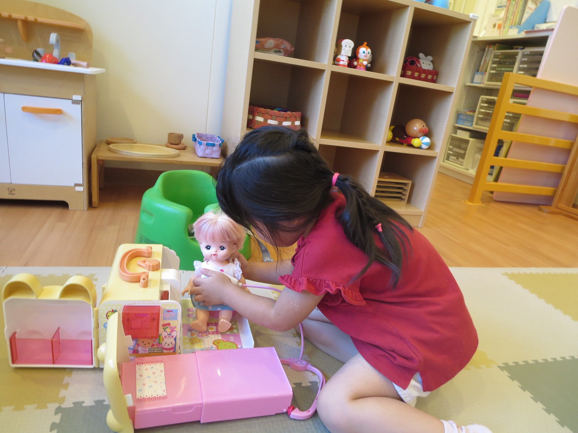 お医者さんになって、めるちゃんの診察。優しく声をかけながらの診察している姿にほっこりしました。