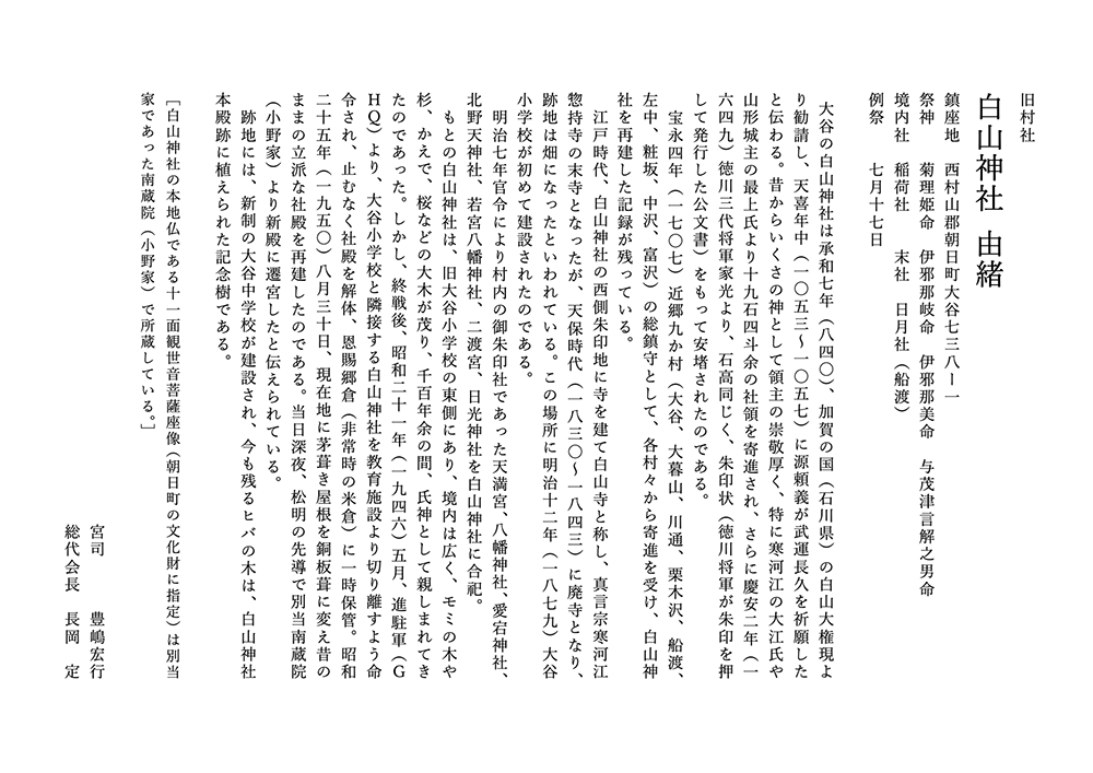 宝永四年(一七〇七)近郷九か村(大谷、大暮山、川通、栗木沢、船渡、左中、粧坂、中沢、富沢)の総鎮守として、各村々から寄進を受け、白山神社を再建した記録が残っている。