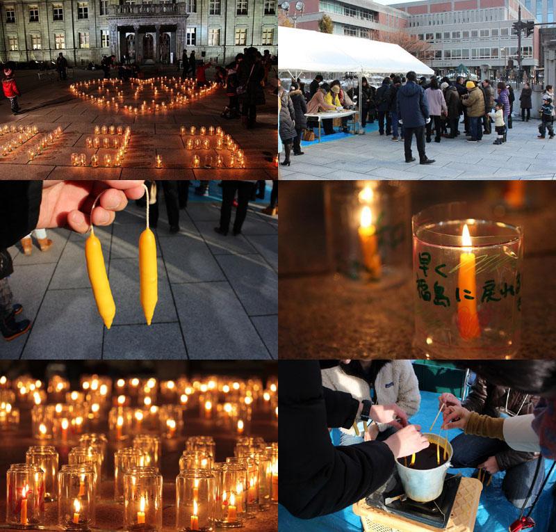 前日の七ヶ浜町同様、双子の蜜蝋キャンドルを無料で製作していただき、一本をガラスシェードに入れて灯しました。火文字は「ハートと3.11」。駆けつけて下さった362人分の優しい灯火で、ハートは見事に明るく輝きました。福島から避難している皆さんも多く参加下さり、シェードに描かれた希望や願い、祈りなど、様々な思いが照らし出されました。