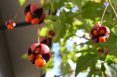 実のなる前は、一見してあまり目立たない控えめな感じのする木なのですが、実のつけ方がちょっと個性的です。果実がカパッと割れて、中から種子がぶら下がっています。