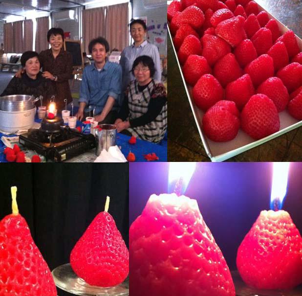 宮城県亘理町の公共ゾーン仮設住宅のお母さん達「アゲイン亘理」のみなさんは、やりがいと少しの実益と亘理の復興を目的に、様々な手芸品を作り販売なさっています。この度、亘理のおいしい苺をキャンドルで伝えようということになり、その作り方をご指導させていただいております。だいぶ作れるようになり試験販売も始めました。クリスマスにはたくさん販売できそうです。