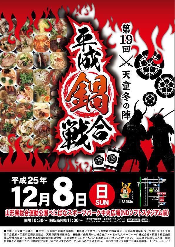 12月8日(日)、「平成鍋合戦」が開催されます!参加鍋は合計33鍋!いろいろな鍋を食べて、あなたの一番好きな鍋を決めよう★最も投票数の多い鍋が「鍋将軍」に選ばれます♪アイディアに富んだ楽しい鍋をぜひお楽しみください♪★鍋合戦とは?★鍋合戦とは、武器を使わずに戦う平和な合戦である。毎回日本国内はもとより、海外の鍋も参戦するこの合戦は、地元の特産品を使った伝統的な鍋やオリジナリティー溢れる新しい味の鍋など、各陣営のプライドをかけた味の戦いである。さぁ、味自慢の兵達よ平成鍋合戦へ「いざ、出陣!」◆詳細◆日時:12月8日(日)開場 10:30〜鍋販売開始 11:00〜場所:山形県総合運動公園べにばなスポーツパーク中央広場(NDソフトスタジアム前)※当館より車10分公式HP: