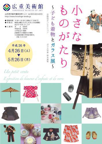 企画展「小さなものがたり〜子ども着物とガラス展〜」 子どもの着物のコレクター 中野和子さん(長井市在住)と、パリで活躍中のガラス作家 鈴木美智さん(山形市出身)によるコラボ展。 中野さんのコレクションは「KINDERS KIMONOS」として2009〜11年に、スイス、オランダ、オーストリア、フランスを巡回し、ヨーロッパの人々を魅了しました。このパリでの展示の際、中野さんは現地で創作活動を続けている美智さんと出会います。異国で出会った日本人そして同郷であったことから二人は意気投合し、ふるさと山形での再会を誓いました。 今回のコラボ展では、中野コレクションから、幕末〜戦前の子どもたちの晴着、遊び着、おもちゃ、また端午の節句にちなんだものなどを多数展示。そして美智さんが着物にインスピレーションを受けて制作したトンボ玉もあわせて展示します。 会期 2014年4月26日(土)〜5月26日(月)休館日 4月30日(水)、5月1日(木)、7日(水)、13日(火)、20日(火)入館料 大人600円 中高大生500円※小学生以下無料※着物でご来館された方は入館無料 【関連イベント】●ギャラリートーク 出演/中野和子さん、鈴木美智さん 日時/5月3日(土)15:00〜●ミニコンサート 〜子どもたちと一緒に♪〜 出演/オカリーナかづき&アコーディオンuko 日時/5月3日(土) 1回目14:00〜 2回目16:00〜 参加/無料(入館料が必要、小学生以下は無料)●トンボ玉体験教室(予約制) 講師/鈴木美智さん 日時/5月10日(土)11日(日)17日(土)18日(日)24日(土) 25日(日) 対象/小学生〜大人(小学生は保護者の付き添いが必要です) 定員/各回5名 参加費/大人2,500円 小中学生2,000円 (材料費・入館料込) 【お問い合わせ】広重美術館山形県天童市鎌田本町1-2-1 TEL.023-654-6555e-mail. info@hiroshige-tendo.jp