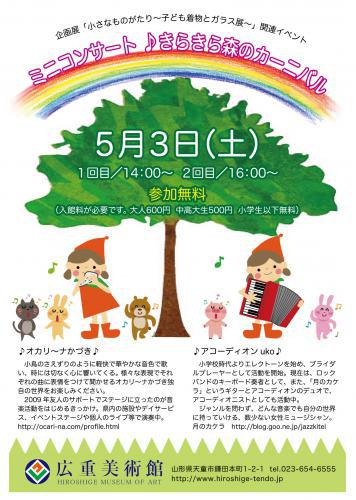 「ミニコンサート ♪きらきら森のカーニバル」企画展「小さなものがたり〜子ども着物とガラス展〜」の開催にあわせて、子ども向けのミニコンサートを開催します!子どもたちは参加無料ですので、ぜひ遊びにきてくださいね。出演/オカリーナかづき&アコーディオンuko日時/5月3日(土) 1回目14:00〜 2回目16:00〜参加/無料(入館料が必要。大人600円 中高大生500円 小学生以下は無料)