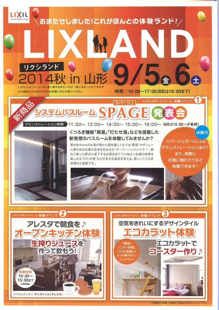 みなさんおはようございます(^0^) 山形市では8月5・6・7日と、賑やかな花笠まつり 開催中ですね〜♪ 午後から雨が降らなければ本日最終日☆行ってみようかなと 思っています (`・ω・´)♪ というわけでまだまだ連日暑い日が続きますが、秋のイベントのお知らせです! 9/5(金)、 6(土) の二日間 10:00〜17:00 (6日は16:00まで)LIXILショールーム(山形市城西町4-27-33) にて LIXLAND リクシランド が開催されます!! ご成約いただきますと、もれなくプレゼントがもらえます(o^^o)詳しくは上記に添付しましたチラシをご覧下さい♪