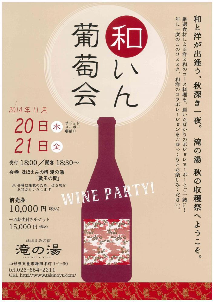 和と洋が出逢う、秋深き一夜。滝の湯秋の収穫祭へようこそ。厳選食材による洋と和のコース料理を、届いたばかりのボジョレヌーボーとご一緒に! ☆和いん葡萄会☆ WINE PARTY2014年11月20日(木)・21日(金)の2日間(11月20日はボジョレヌーボー解禁日)受付 18:00 / 開宴18:30〜会場 蔵王の間  ※会場は座敷のため、はき物をお預かりいたします前売券 10,000円(税込) / 1泊朝食付きチケット15,000円(税込) 年に1度のこのひととき、和洋のコラボレーションをごゆっくりとお楽しみください。