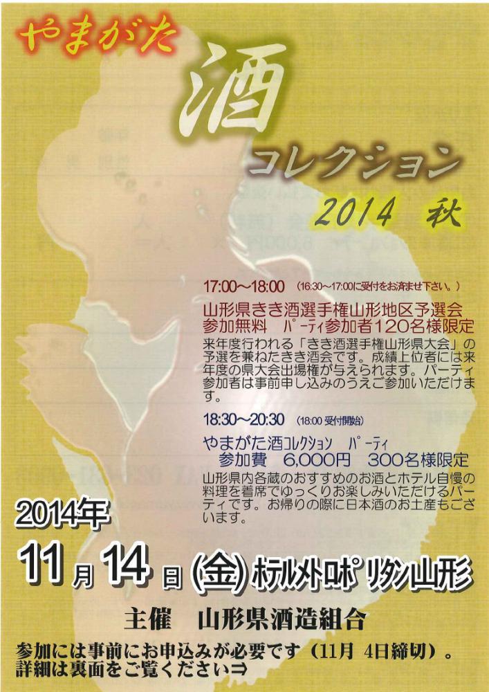 毎年好評をいただいておりました「山形酒歓評会」が、「やまがた酒コレクション」と名前も新たに、今年も開催されます。東北清酒鑑評会用の出品酒から、お燗で美味しいお酒まで、山形県内各蔵のおススメのお酒とホテル自慢のお料理を堪能できるパーティーです。さらに、お帰りの際は日本酒のお土産つき! 2014年11月14日(金) ホテルメトロポリタン山形参加費6,000円 300名様限定お席の数もあとわずかです。ご興味のある方はお早めにお申し込みください。