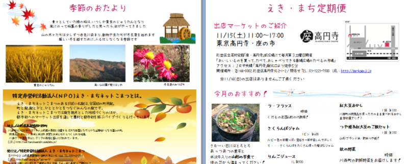 NPO法人えき・まちネットこまつにはファンクラブがあります。現在の会員数は315名。といっても、理事長の江本と名刺交換した人は”NO”の意思表示がない場合、一度は入会になりますので、よろしくお願いします。今回は、11月号のファンクラブ通信を掲載します。といってもスキャナーの調子が悪いので、プリントスクリーンで切り取ったイメージ図を載せてみました。全体をご覧になりたい方や、購読希望の方は、えき・まちネットこまつまでご連絡下さい。
