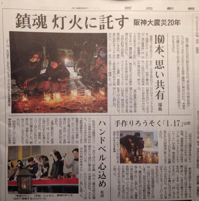 被災地福島市蓬莱地区でも20年の1.17を祈る追悼のロウソクが灯されました。吹雪の中、みんなで灯りを守り、同じ被災地としての思いを共有下さいました。写真は河北新報の福島版の記事ですが、山形の様子も一緒に紹介されています。