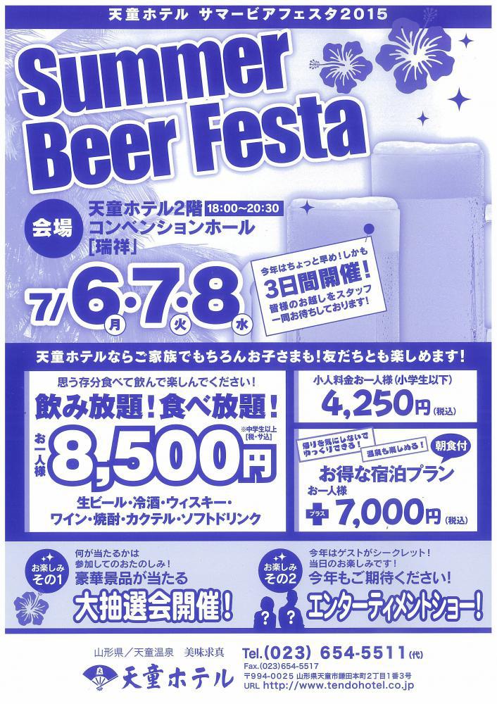 毎年恒例の夏イベント、今年は7月6・7・8日の3日間開催!賑やかな夜を美味しいビールと美味しい料理で楽しみましょう!今年はどんなゲストが盛り上げてくれるのか・・・当日までシークレット♪どうぞお楽しみに*^^*そして、終盤には豪華景品が当たる大抽選会もございます!ぜひご参加ください! チケットのお求めは、お電話または当館スタッフまで♪◆詳細◆日時:2015年7月6日、7日、8日 18:00〜20:30場所:天童ホテル2階コンベンションホール「瑞祥」料理:和洋中豪華バイキング飲物:飲み放題(生ビール、冷酒、ウィスキー、ワイン、焼酎、カクテル、ソフトドリンク)料金:大人8,500円(税込)、小学生以下4,250円(税込)宿泊も歓迎!一泊朝食付7,000円(税込)▼お問い合わせ・チケット購入天童ホテル TEL 023-654-55111 美味求真の宿 天童ホテル 公式HPhttp://www.tendohotel.co.jp/