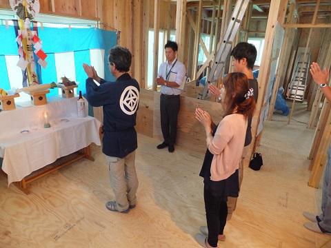 無事に棟木も上がり、本日めでたく、H様邸の上棟式を迎える事ができました。式も滞りなく進み、最後に参加者全員で乾杯をいたしました。季節は梅雨の時期に入っていますが、晴れの日が続いています。体調管理には十分気をつけて工事を進めてまいります。