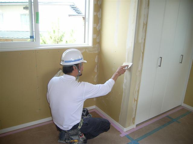 クロスやさんが乗り込みです。まずはパテ処理から施工スタートです。