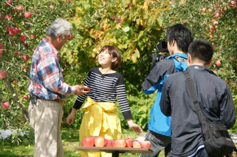 秋晴れの中、りんごの樹の下でテレビの取材がありました。りんごづくしの内容です。いっぱいりんご食べていましたよ。YBCぴよ卵ワイド10月15日木曜日16:53〜「んまいもの食べドキッ」に登場します。