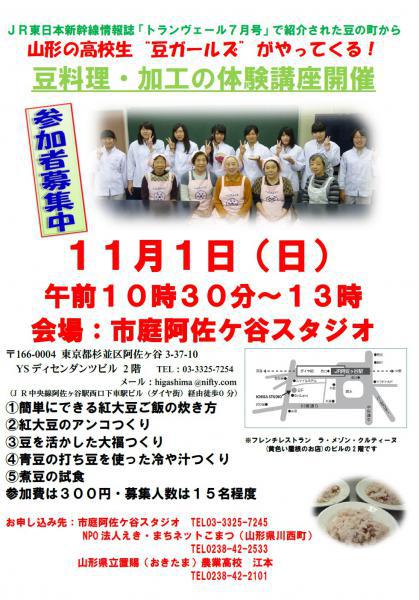 皆様に再度ご案内いたします。11月1日(日)、東京都杉並区阿佐ケ谷の市庭阿佐ケ谷スタジオにおいて、山形県立置賜農業高校の女子生徒4名による豆料理・加工ワークショップが開催されます。現在のところ参加希望者は8名。まだ、定員まで余裕がございますので是非ご出席を下さいますようお願いいたします。尚、参加者には、高校生が考えて市販化されている地元の豆を餡にした大福を進呈いたします。ヘルシーな豆料理や、おいしい豆菓子のワークショップにおいでください。