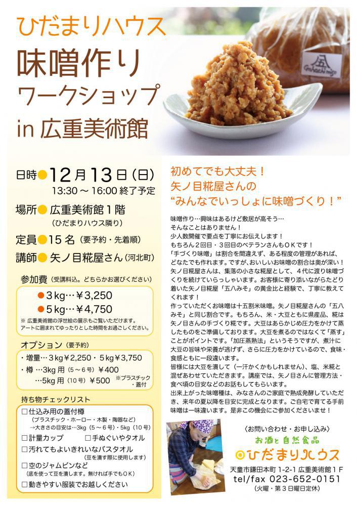こんにちは☆寒い冬の到来ですね〜さてさて、本日はワークショップのお知らせです(^^)今年の2月に開催した味噌作りワークショップ、ご好評につき、第二回『味噌作りワークショップin広重美術館』を開催いたします*\(^o^)/*今回も河北町の矢ノ目糀屋さんより、日本の発酵調味料の素晴らしさを説明いただきながら、矢ノ目さんの黄金比で作る”五八みそ”の仕込みを丁寧にご指導いただきます(^^)是非この機会に、ご参加くださいませ(^^)尚、先着順とさせていただきます、お早めにご予約ください(^_−)−☆