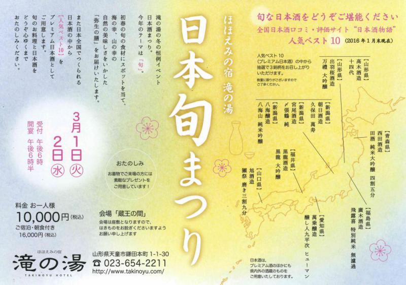 3月1日(火)・3月2日(水)の2日間、滝の湯イベント「日本旬まつり」が開催されます。旬をテーマに滝の湯自慢のお料理とプレミアム日本酒をご用意させていただきます。旬の料理と日本酒を楽しみながら、春のおとずれを感じてみませんか〜