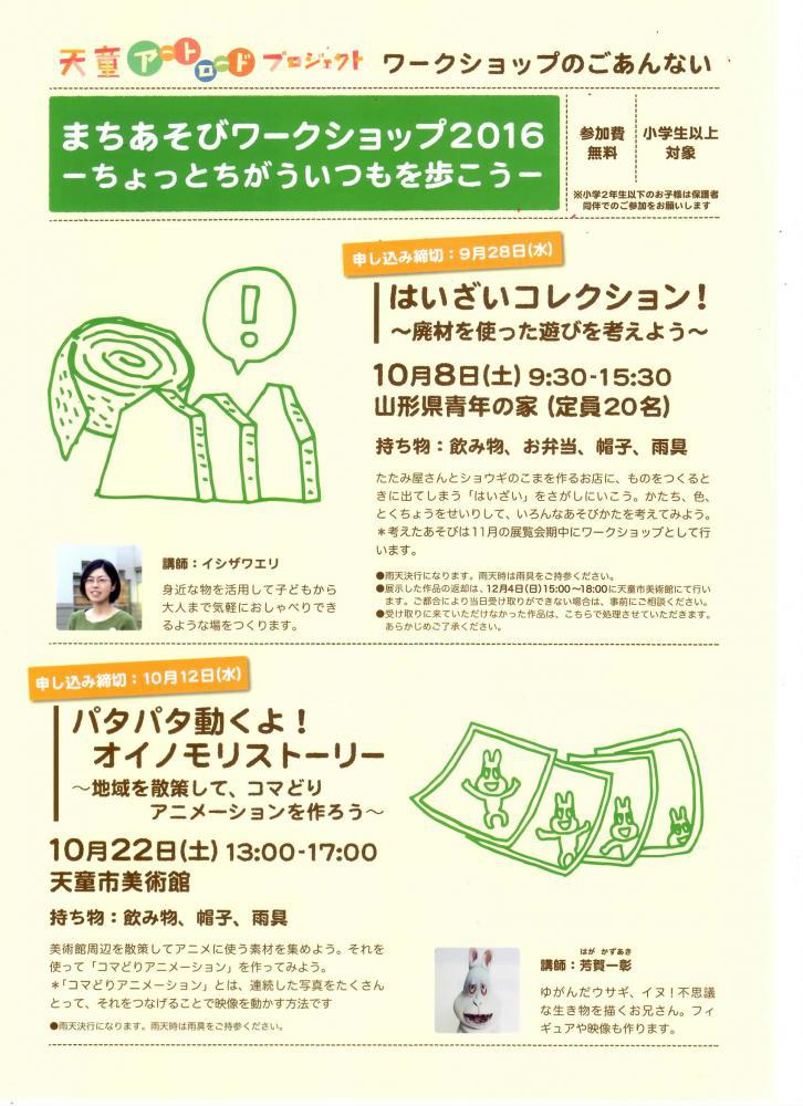 地域を散策したり、ものづくりをしたりしながら、地域をちょっとちがう視点からとらえてみませんんか?「天童アートロードプロジェクト」の秋のワークショップが始まります!子どもから大人の方まで、どうぞお気軽にご参加ください。 ●●●ワークショップ1●●●「はいざいコレクション!〜廃材を使ったあそびを考えよう〜」たたみ屋さんとショウギのこまを作るお店に、ものをつくるときに出てしまう「はいざい」をさがしにいこう。かたち、色、とくちょうをせいりして、いろんなあそびかたを考えてみよう。【概要】日時:2016年10月8日(土) 9:30〜15:30会場:山形県青年の家(天童市小路1-7-8)講師:イシザワエリ対象:小学生以上〜*小学2年生以下は保護者同伴でお願いいたします。持ち物:飲み物、お弁当、帽子、雨具申し込み締め切り:9月28日(水) ●●●ワークショップ2●●●「パタパタ動くよ!オイノモリストーリー〜地域を散策して、コマどりアニメーションを作ろう」美術館周辺を散策してアニメに使う素材を集めよう。それを使って「コマどりアニメーション」を作ってみよう。*「コマどりアニメーション」とは、連続した写真をたくさんとって、それをつなげることで映像を動かす方法です。【概要】日時:2016年10月22日(土) 13:00〜17:00会場:天童市美術館(天童市老野森1丁目2-2)講師:芳賀一彰対象:小学生以上〜*小学2年生以下は保護者同伴でお願いいたします。料金:無料持ち物:飲み物、帽子、雨具申し込み締め切り:10月12日(水)★料金★どちらも無料です★申し込み★以下の連絡先にご連絡ください。Email:tendou.art.road.project@gmail.comTEL:080-5573-2034(事務局イシザワ)★展覧会への展示★このワークショップで制作した作品は、11月20日(日)〜12月4日(日)に天童市美術館での展覧会にて展示します!こちらもお楽しみに!!