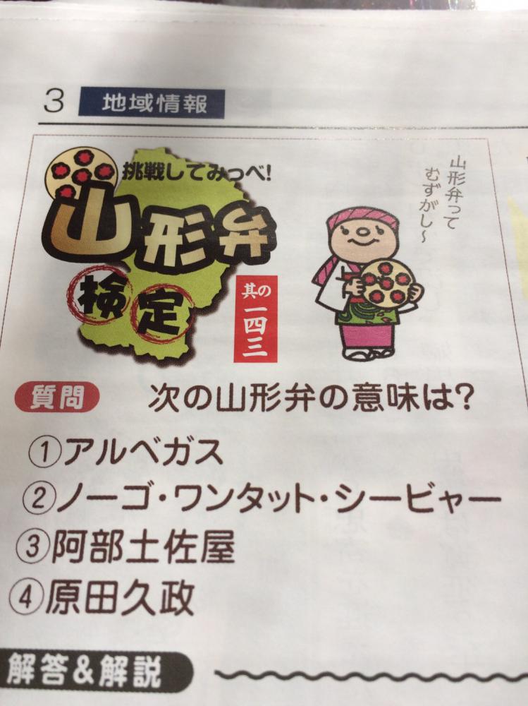 先日、新聞でおもしろい記事を見つけました♪あなたは次の山形弁の意味がわかりますか? @アルべガスAノーゴ・ワンタット・シービャーB阿部土佐屋C原田久政 声に出してみるとわかりやすいかもしれません★さぁ、あなたはいくつ分かるかな?正解は明日お知らせします!美味求真の宿 天童ホテル 公式HP