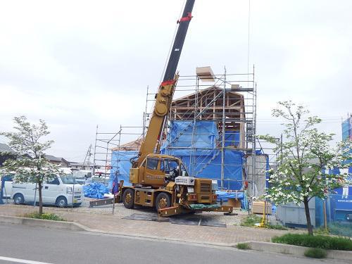 本日、こちらの現場では建て方がおこなわれました。クレーンを使用しての建て方でしたが、安全面に注意し無事に棟上げまで工事を進められました。これから現場では屋根を葺いて構造関係の施工に取りかかります。引き続き安全面に考慮しながら、まずは上棟式に向けて工事を進めてまいります。またご報告いたします。