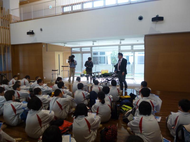 朝日中学校の新1年生47名が福祉についての課外学習のため来荘しました。福祉施設の役割や、入居者の方がどのような器具を使用して過ごしているのかなどを説明しました。生徒全員が説明を真剣に聞いて多くの質問を受けました。また、アイマスク着用で、人を誘導することの難しさ、目の見えない方にわかりやすく説明することを学びました。最後に、生徒全員から朝日中学校校歌のプレゼントがありました!入居者の方々も聴きに来られ、元気な歌声を楽しまれました。※YBC news every.(山形放送)とTUY Nスタやまがた(テレビユー山形)が取材にきました。