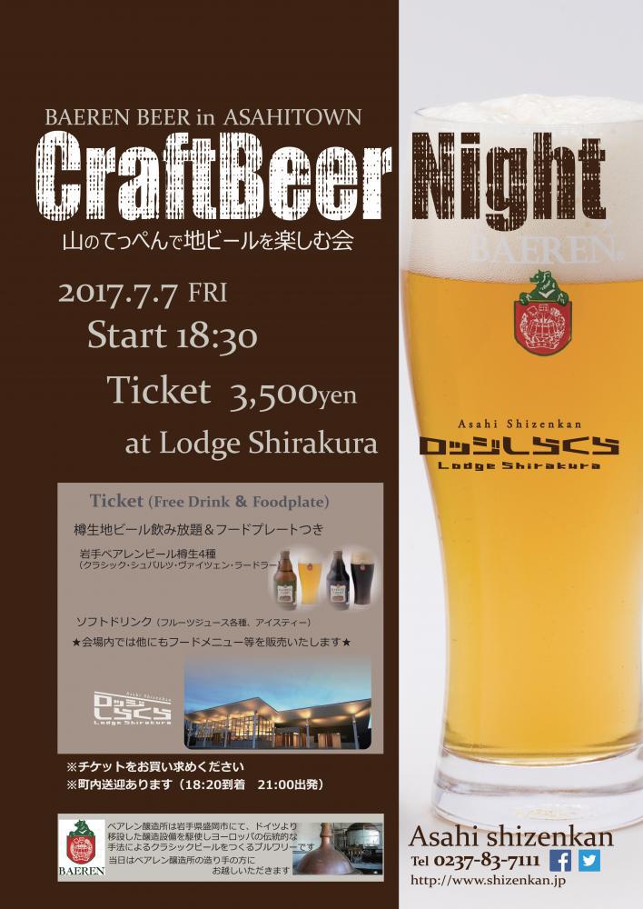 BAEREN BEER in ASAHITOWN////////「Craft Beer Night」////////〜山のてっぺんで地ビールを楽しむ会〜岩手県にてドイツから移設した醸造設備を駆使し、ヨーロッパの伝統的な製法によるクラシックビールを造るブルワリー「ベアレン醸造所」の直送樽生ビールを思いっきり楽しむ「Craft Beer Night」を新しくなった「ロッジしらくら」にて初めて開催いたします。ベアレン醸造所とは朝日町ブランド大学を通したご縁がきっかけとなり、初のコラボイベントを行う運びになりました。当日はブランド大学で講師をされたベアレン醸造所専務の嶌田氏にお越しいただきベアレンビールについてお話をいただく予定です。クラシック、シュバルツ、ヴァイツウェン、ラードラー4種の樽生ビールが飲み放題!!さらに、地元朝日町でドイツ食肉マイスター直伝の技により手作りした食肉工房「ロイフェン」のソーセージをはじめとするフードプレートがセット!!ほかにも会場内ではビールに合うフードの販売も行います。※前売りのチケットをお買い求めください(当日券はございません、チケットは数に限りがありますのでお早めにお買い求めください)※町内送迎あります(18:20到着 21:00出発 要予約)◇期日 7月7日(金)◇時間 18:30〜◇料金 3,500円(チケット代)◇場所 ロッジしらくら問合せ先 Asahi自然観 0237-83-7111