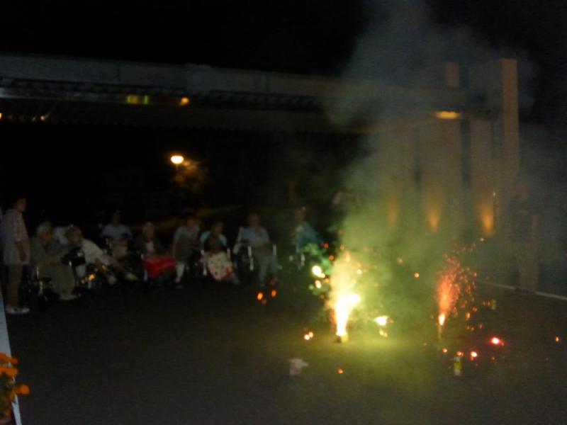 夏の夜といえば、花火ですね!8月11日の夜、施設正面玄関前で入居者さんと一緒に花火をしました。いつもは寝る準備を整えてお部屋にいる時間ですが、今日は皆さん外に行く準備万端にしています。辺りが暗くなった6時半すぎに、地面に置いた噴出花火の点火で始まりました。噴水のように吹き上げる花火はなかなか迫力があります。入居者さんの手に持った花火に点火すると、様々な色の火花が弾けます。「きれいだなぁ」と大変喜ばれていました。目の不自由な入居者さんも参加して手持ち花火をしたところ、火薬の匂いやパチパチという火花の弾ける音に「懐かしい」「久しぶりだ」との声が聞こえました。参加した入居者さんと職員は、とても楽しい夏の夜を過ごしました!