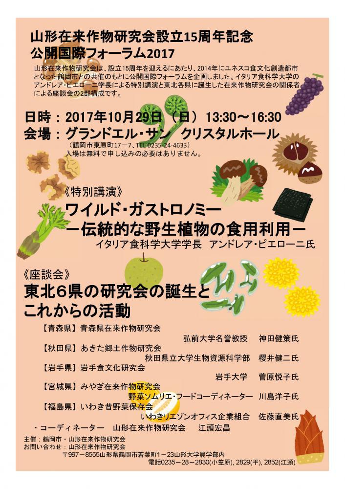 山形在来作物研究会は、設立15周年を迎えるにあたり、2014年にユネスコ食文化創造都市となった鶴岡市との共催のもとに公開国際フォーラムを企画しました。イタリア食科学大学のアンドレア・ピエローニ学長による特別講演と東北各県に誕生した在来作物研究会の関係者による座談会の2部構成です。日時:2017年10月29日(日)13:30〜16:30会場:グランドエル・サン クリスタルホール        (鶴岡市東原町17−7、TEL 0235-24-4633)   入場は無料で申し込みの必要はありません。内容:第1部《特別講演》ワイルド・ガストロノミー −伝統的な野生植物の食用利用−    イタリア食科学大学学長 アンドレア・ピエローニ氏 第2部《座談会》東北6県の研究会の誕生とこれからの活動【青森県】青森県在来作物研究会 弘前大学名誉教授  神田健策氏【秋田県】あきた郷土作物研究会 秋田県立大学生物資源科学部 櫻井健二氏【岩手県】岩手食文化研究会 岩手大学教育学部  菅原悦子氏【宮城県】みやぎ在来作物研究会 野菜ソムリエ・フードコーディネーター 川島洋子氏【福島県】いわき昔野菜保存会 いわきリエゾンオフィス企業組合 佐藤直美氏 コーディネーター 山形在来作物研究会  江頭宏昌 主催:鶴岡市・山形在来作物研究会お問い合わせ:山形在来作物研究会      〒997−8555山形県鶴岡市若葉町1−23山形大学農学部内                電話0235−28−2830(小笠原), 2829(平), 2852(江頭)