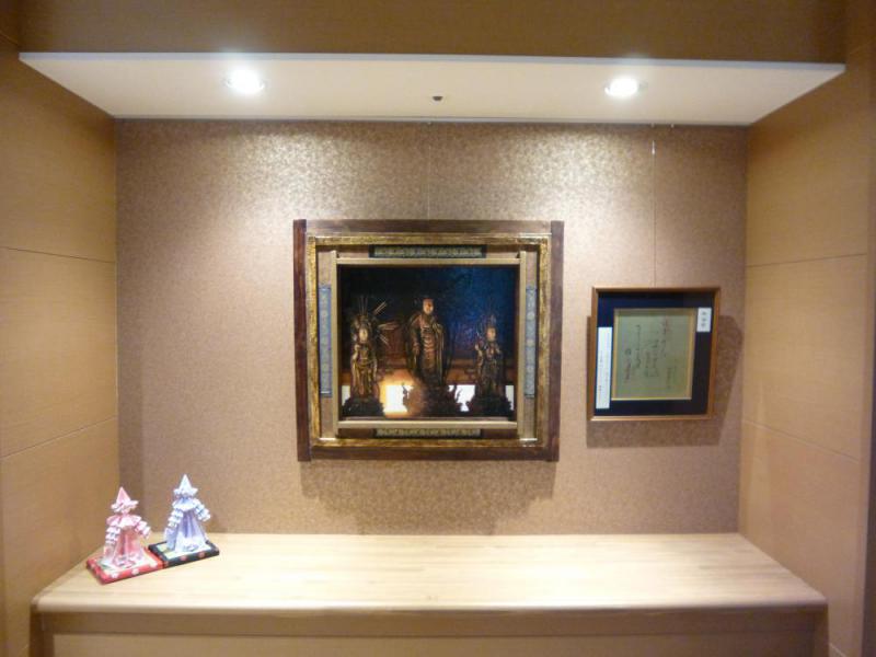 このたび寄贈された仏像画は、兵庫県の浄土寺にまつられている「阿弥陀三尊立像」です。阿弥陀三尊立像の背後から夕陽が照らされている情景を写し取った絵画は、神秘的で厳かな雰囲気を感じます。また、作者の小田先生より「目が見える見えないに関わらず〈南無阿弥陀仏〉と唱えて、前世の慈悲、来世での慈悲を祈願していただければありがたい」とのお言葉をいただきました。額縁は作者の手作りであり、三尊がまつられている浄土堂(阿弥陀堂)に見立て作成されています。一般的な絵画は、ガラス等で前面が覆われていると思いますが、今回いただいた先生の仏像画は目の見えない方に直に触って感触を感じていただけるように覆われておりません。さっそく、目の見えない方に触っていただき、絵画を指先から感じていただきました。「阿弥陀如来様と観音菩薩様と勢至菩薩様が描かれていますよ」と伝えると「ありがたい絵だ」と手を合わせる姿もみられました。「阿弥陀三尊立像」の仏像画は1階の交流ホール前の廊下に飾っております。来荘の際は是非ご観覧ください。