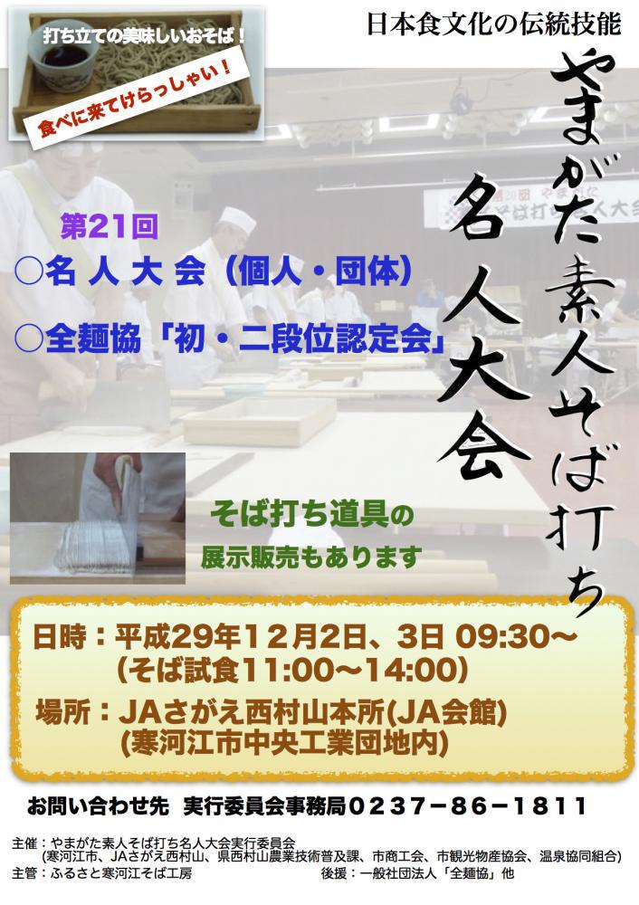 2017年やまがた素人そば打ち名人大会等を、下記のとおり開催します。どうぞ皆さん奮ってごご来場下さい。(参加者の募集は締め切りました。) ○第21回やまがた素人そば打ち名人大会 《そば打ちをこよなく愛する全国の男女の愛好家が、日頃の腕を競い合い名人を目指します。個人の部と団体の部があり、元祖ふるさと寒河江そば工房の団体の部は男女4名で交代でそばを打ちます。全国名人級も多数参加》 12月3日(日) 09:30〜 ○初段・二段位認定大会 《素人そば打ちの登竜門。初段は初心者で家族に喜んでもらえるそば打ち技術を、二段は更に上の段位に挑戦し日頃の技を披露します。》 12月2日(土)09:30〜 開催場所:寒河江市 JAさがえ西村山本所 特設会場 991-0061 寒河江市中央工業団地75 問合せ先(お電話でのお問い合わせのみになります。) 大会事務局(中平、中野) 991-0523 寒河江市大字八鍬字川原919−6 さくらんぼ会館内 п@0237-86-1811 ※会場では打ちたての美味しいお蕎麦が食べられます(11:00〜14:00、有料)。また、そば打ち道具の展示販売も予定します。どおぞお気軽にお越し下さい。 ※また、「全麺協日本そば大学講座東日本学舎in寒河江」を平成30年2月に開催予定しています。 ※音楽に合わせて楽しくそばを打つパフォーマンスをYouTubeで公開しています。YouTubeの検索欄に「ふるさと寒河江」、「そば打ち」と入力し検索してご覧下さい。