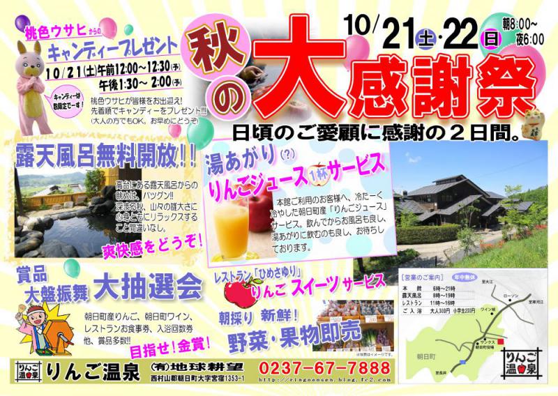 毎年恒例となりましたお客様感謝祭を開催します。露天風呂を無料開放するほか、りんごジュースのサービス桃色ウサヒもやってきます。ぜひご来館下さい。とき 10月21日(土)・22日(日)内容 ・露天風呂無料開放 ・りんごジュースのサービス(お一人様1杯) ・桃色ウサヒからのキャンデープレゼント ・レストラン「ひめさゆり」でお食事のお客様に 採れたてりんごを使ったスィーツのサービス ・朝採り野菜・果実の即売 ・はずれクジなしの大抽選会 等など