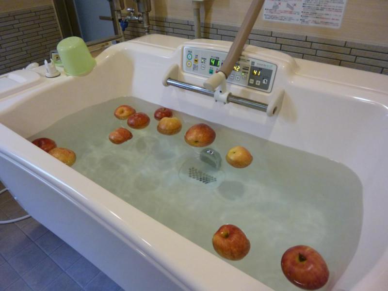 朝日町に「りんご温泉」という日帰り入浴施設があることは皆様ご存知でしょうか?天然かけ流しの温泉ですが、なんとぷかぷかリンゴ(本物!)が浮いています。ちょうどりんごの季節でもあるので、和合荘でもりんご風呂を行いました。さすがに温泉は準備できませんが、りんごを浮かべて入居者の皆さんに楽しんでもらいます。入浴前に職員からの「食べちゃだめですよー」との掛け声に笑いが起こる一場面も見られました。ふわりと香るりんごの甘い香りに、穏やかに入浴されていたようです。