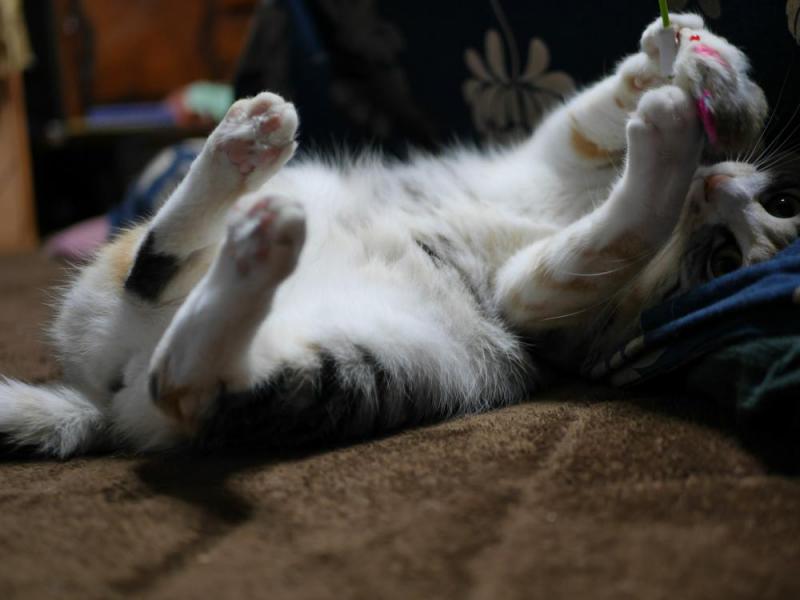 寝っ転がって、紐にくっつけたネズミちゃんで遊んでいます!