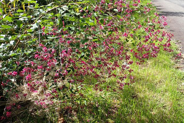 9/28ミヤマニガウリの両性花の様子観察に行きました。「温室」作り最盛期かもしれない。実の裂果も始まっていました。ヤマハギが管理車道に垂れて。