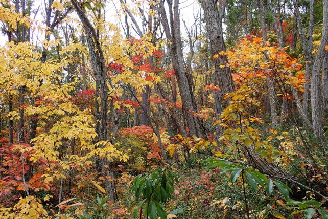 見事な赤松林で自生の「マツタケ」と栽培もしていた。戦後様相変わりでコナラ伸びそして枯れはじめている。でも低木の紅葉は見頃だ。