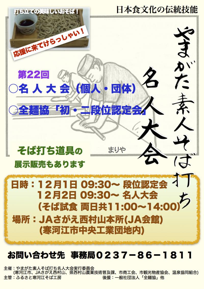 2018年やまがた素人そば打ち名人大会等を下記のとおり開催します。どうぞ皆さん奮ってご来場ご声援下さい。(参加者の募集は締め切りました。) ○22回やまがた素人そば打ち名人大会 《そば打ちをこよなく愛する全国の男女の愛好家が、日頃の腕を競い合い名人を目指します。個人の部と団体の部があり、元祖ふるさと寒河江そば工房の団体の部は男女4名で交代でそばを打ちます。全国名人級も多数参加》 12月2日(日) 09:30〜 ○初段・二段位認定大会 《素人そば打ちの登竜門。初段は初心者で家族に喜んでもらえるそば打ち技術を、二段は更に上の段位に挑戦し日頃の技を披露します。》 12月1日(土)09:30〜 開催場所:寒河江市 JAさがえ西村山本所 特設会場 991-0061 寒河江市中央工業団地75 問合せ先(お電話でのお問い合わせのみになります。) 大会事務局(佐々木、中野) 991-0523 寒河江市大字八鍬字川原919−6 さくらんぼ会館内 п@0237-86-1811 ※会場では打ちたての美味しいお蕎麦が食べられます(11:00〜14:00、有料)。また、そば打ち道具の展示販売も予定します。どおぞお気軽にお越し下さい。 ※音楽に合わせて楽しくそばを打つパフォーマンスをYouTubeで公開しています。YouTubeの検索欄に「ふるさと寒河江」、「そば打ち」と入力し検索してご覧下さい。