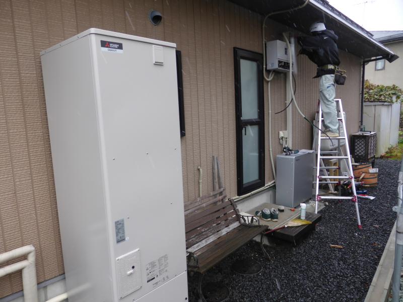 パラパラと雪が降るなか、今日はエコキュートと蓄電池設置の工事を行いました。