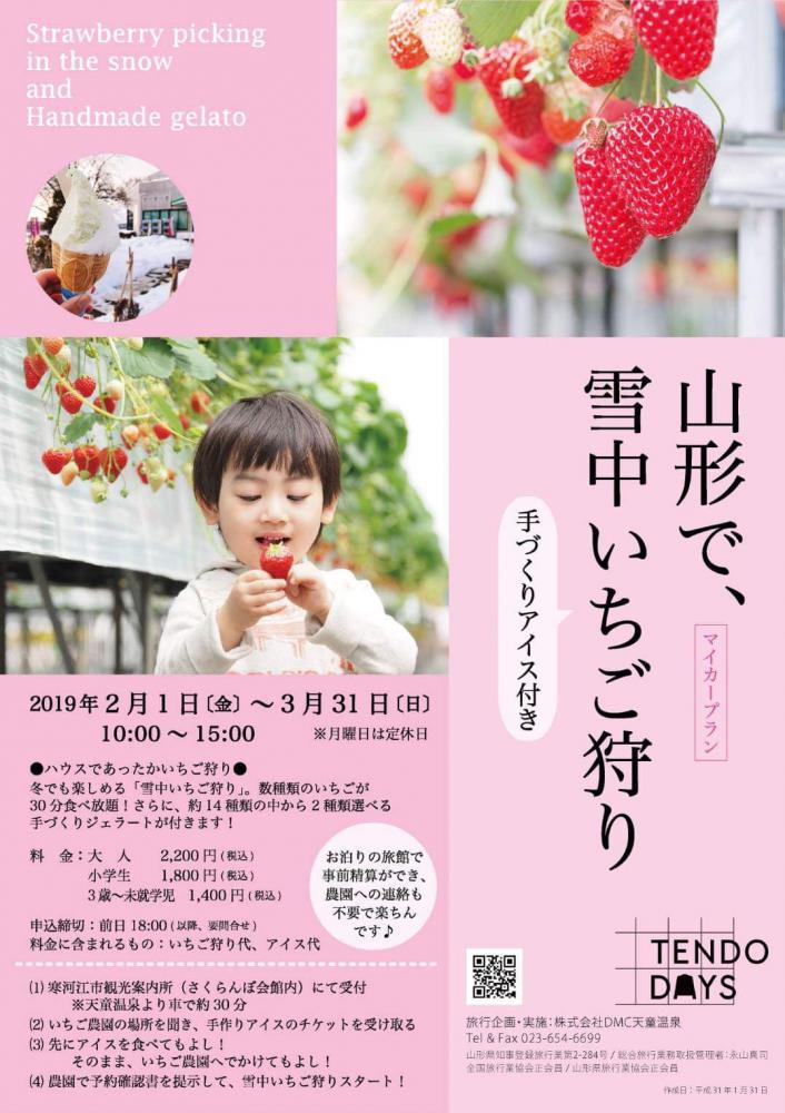 いちご好きの皆様、お待たせ致しました!本日より雪中いちご狩りプラン販売でございます♪実はこちらの企画、いちご狩りの他に特典として手作りアイスも食べられます!大人も子供も一緒に楽しめるいちご狩りプラン、いかがでしょうか?皆様のご予約お待ちしております♪▼ご予約はこちらから▼『山形で、雪中いちご狩り』フルーツ王国山形で人気のいちご狩り&癒しの湯天童温泉を満喫♪美味求真の宿 天童ホテル 公式http://www.tendohotel.co.jp/