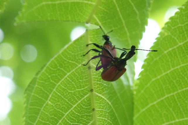 サワグルミの葉でオトシブミを作っているオトシブミ。葉を筒にする為の最初の準備として、主葉脈に同間隔に切り口をつくり、丸め易くする。