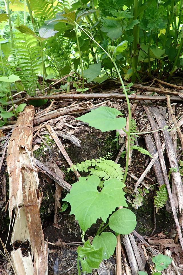 ミヤマニガウリは6/22現在30cmに成長している。葉腋からでる「巻ヒゲ」の威力である。先端は二股になっていて、手当たり次第つかまり本体を支える。