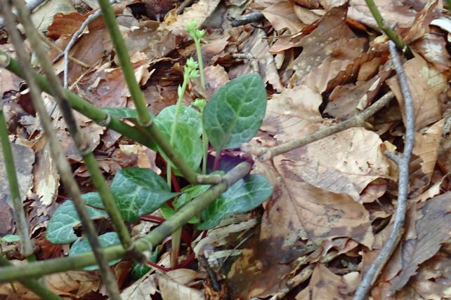 一薬草(Pyola iaponica)落葉長柄 卵状楕円形 細かい鋸歯 低山の林中(ブナ林沿い)高木の伸張により採光の位地が変化して移動繁殖する。要観察。
