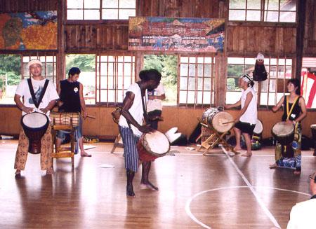 競技は無風だったせいか、昨年から比べると全体的に飛ぶ飛行機は少ないようでしたが、ドラマはありました。途中、雨が降り中断したのですが、駆けつけてくれていたギニアの民俗楽器を演奏なさる「サンバララ」の皆さんが体育館で演奏して下さったのです。思わぬ本場の演奏に大人も子どもも魅了されていました。演奏が終わる頃には、青空が戻り、ドラマチックに競技を再開することができました。