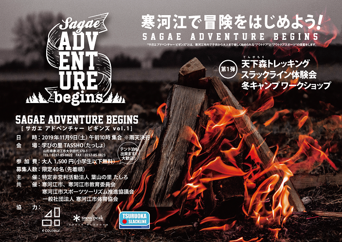 11月9日(土)、「SAGAE ADVENTURE BEGINS 」の第1回目を学びの里TASSHOで開催します。トレッキングやスラックライン体験、冬キャンプのワークショップ等を行います。
