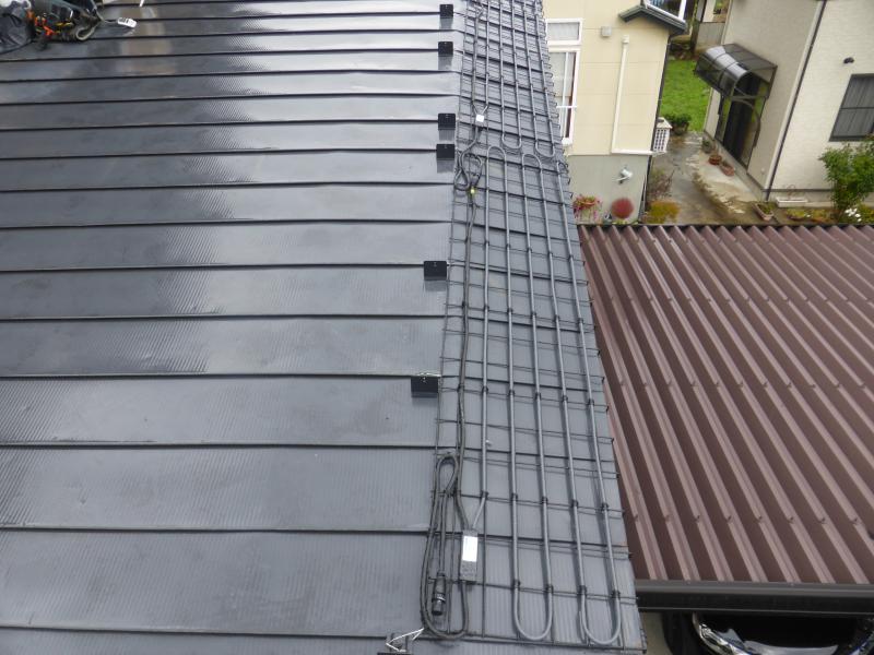 板金屋根の下に入れる融雪が多いのですが、今回は屋根形状の都合で板金屋根の上に敷設タイプの融雪です。