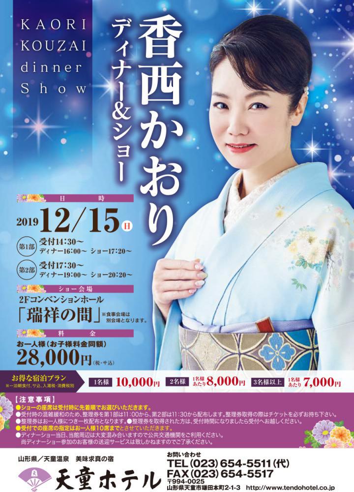 今年のディーナー&ショーは『香西かおり』さんをお迎えして開催いたします!たくさんのご来場お待ちしております。【日時】2019年12月15日(日)第1部/受付14:30〜 ディナー16:00〜 ショー17:20〜第2部/受付17:30〜 ディナー19:00〜 ショー20:20〜【料金】お一人様28,000円(税・サ込)※お子様料金同額《一泊朝食付のご宿泊も併せてどうぞ! 》1名様 10,000円2名様一室時お一人様8,000円3名様以上一室時お一人様7,000円※サービス料込、消費税・入湯税別【注意事項】※ショーの座席は受付時に先着順でお選びいただきます。※受付時の混雑緩和のため、当日整理券を配布します。 第1部は11:00から、第2部は11:30から配布します。 整理券取得の際は必ずチケットをお持ちください。※整理券はお一人様につき1枚配布となります。※整理券を取得された方は、受付時間になりましたら受付へお越しください。※受付での座席はお一人様10席までとさせていただきます。※当日は大変混み合いますので公共交通機関をご利用ください。※ディナーショー参加のお客様の送迎サービスは致しかねますのでご了承ください。▼チケット購入・宿泊予約・各種お問合せは美味求真の宿 天童ホテル TEL 023-654-5511メール問合せはこちら美味求真の宿 天童ホテル 公式HPhttps://www.tendohotel.co.jp/