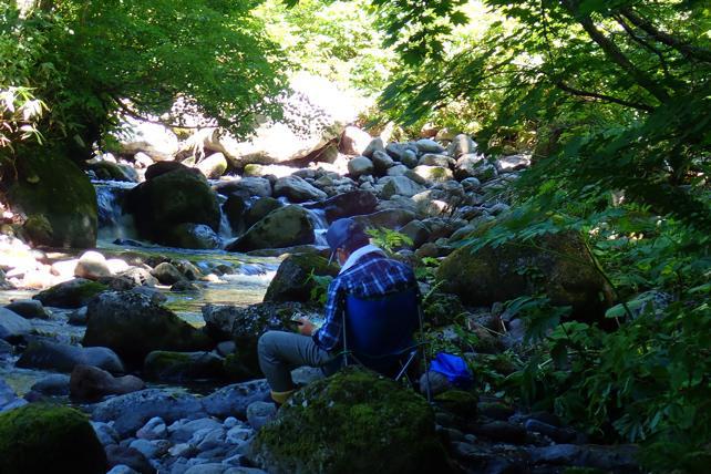 最高の熱中山形で37℃という暑さの中、一名欠15名の参加でした。暫く会えなかったからでしょう。石跳川沿い、ブナ林木漏れ日の道などそれぞれ涼の蔭で描いていました。