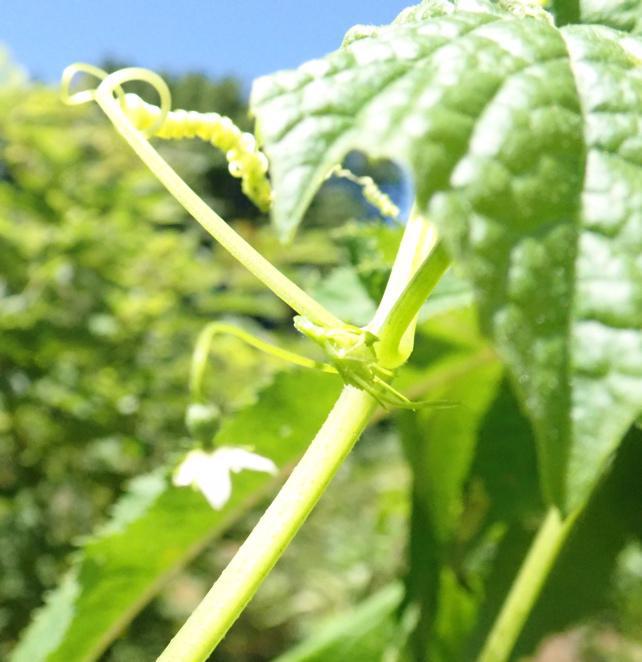 9/20現在のニガウリです。親水公園の北側にある薮に沿ったミヤマニガウリ1mmの小さい子房が。 長柄の実、両性花花序、頂点の子葉たち。