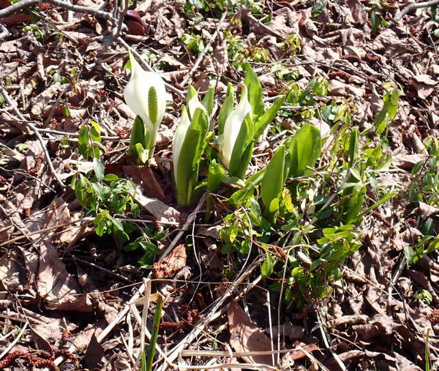 メインのミズバショウが咲き始めていました。全体がハンノキ林です。