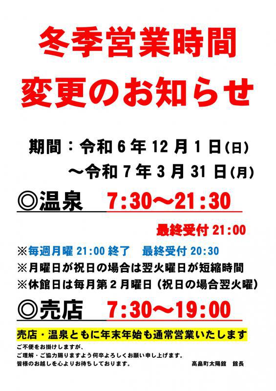 日頃から太陽館をご利用いただきありがとうございます。12月1日より冬季営業時間へと変更となります。〇温泉 入浴時間:7時30分〜21時30分(最終受付 21時00分) ※毎週月曜日21時終了(最終受付20時30分) ※月曜日が祝日の場合は翌火曜日が短縮時間となります。〇売店 営業時間:7時30分〜19時00分なお、温泉・売店ともに年末年始も通常営業となりますご不便をおかけしますが、ご理解・ご協力賜りますよう何卒よろしくお願い申し上げます。皆様のお越しを心よりお待ちしております。高畠町太陽館 館長