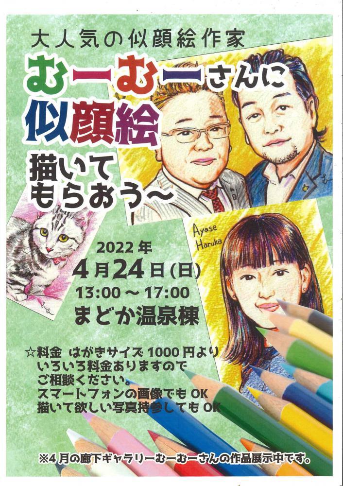 2022.4月24日(日)場所:まどか温泉棟ロビー時間:13:00〜17:00※料金、はがきサイズ1,000円より、いろいろ料金あります。ご相談下さい。スマートフォンの画像でもOK描いて欲しい写真持参してもOKです。