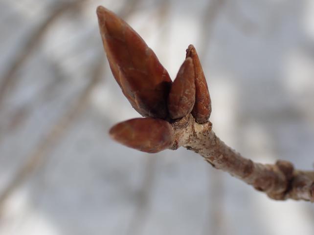 頂芽、側芽1〜2 ミズナラの冬芽です。頂芽が害を受けたとき側芽がそれに変わる。北海道でも同類のカシワは北限ぎりぎりまで成育を広げている。